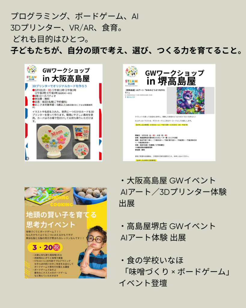 プログラミング、ボードゲーム、AI、3Dプリンター、VR/AR、食育。